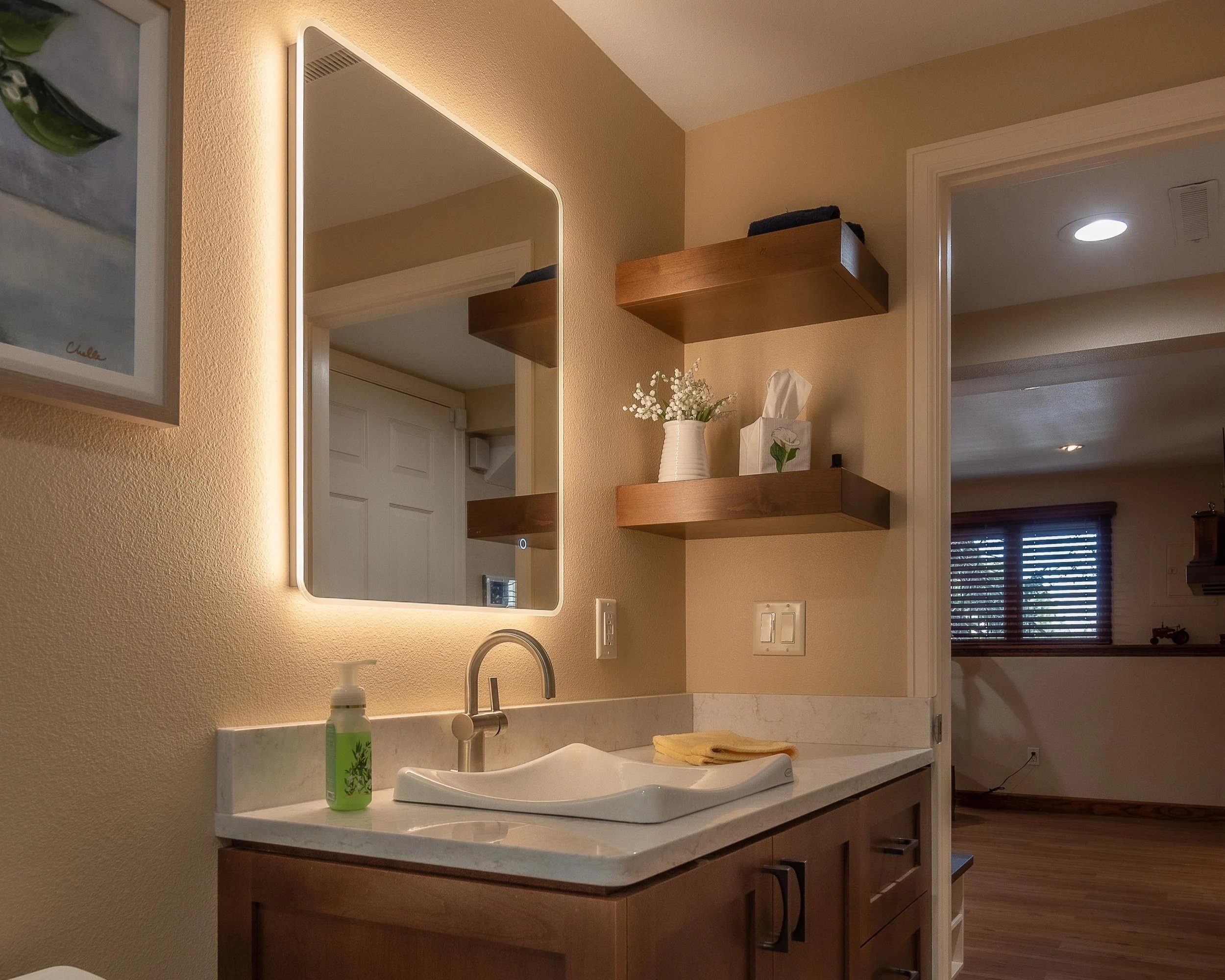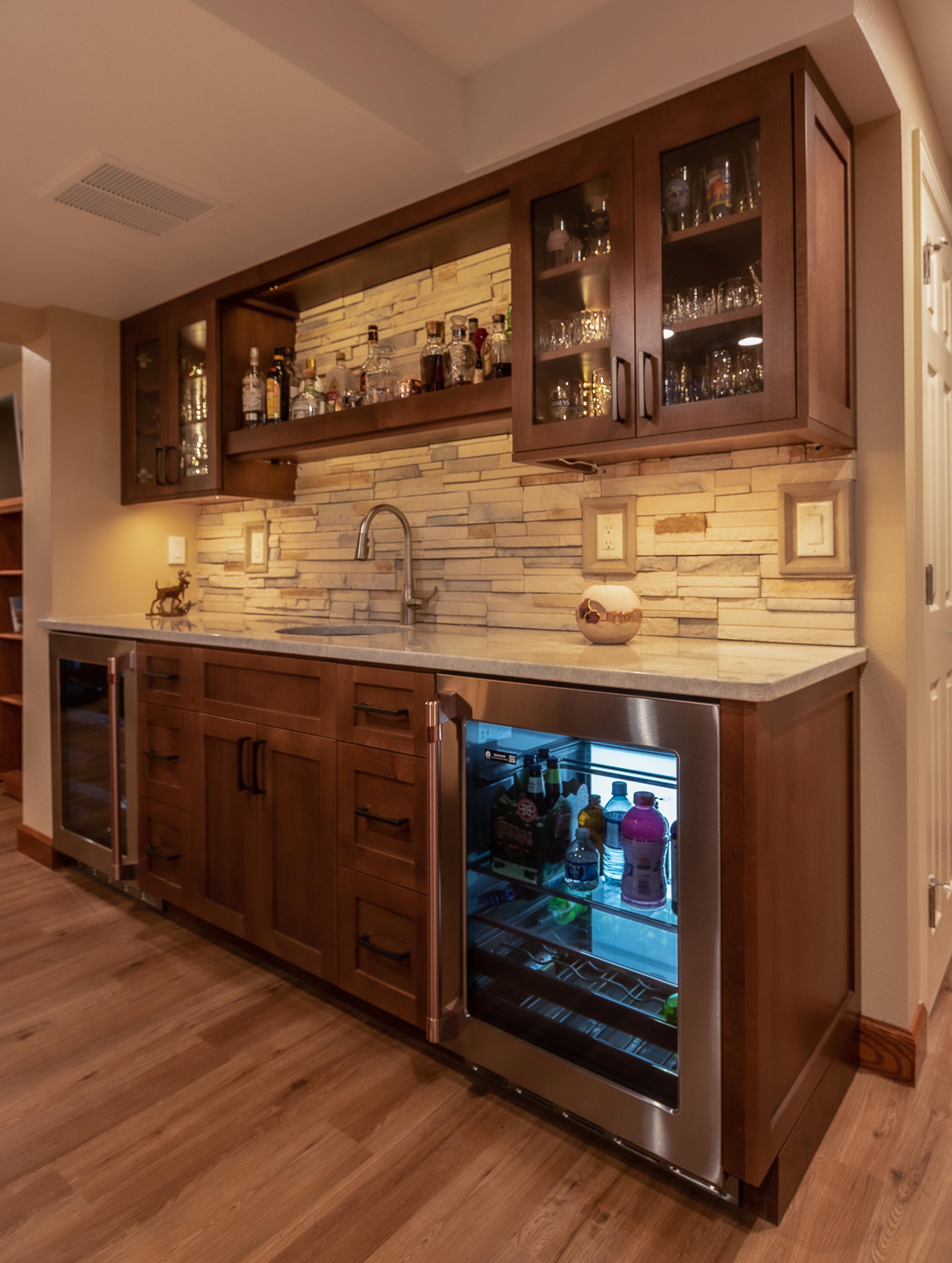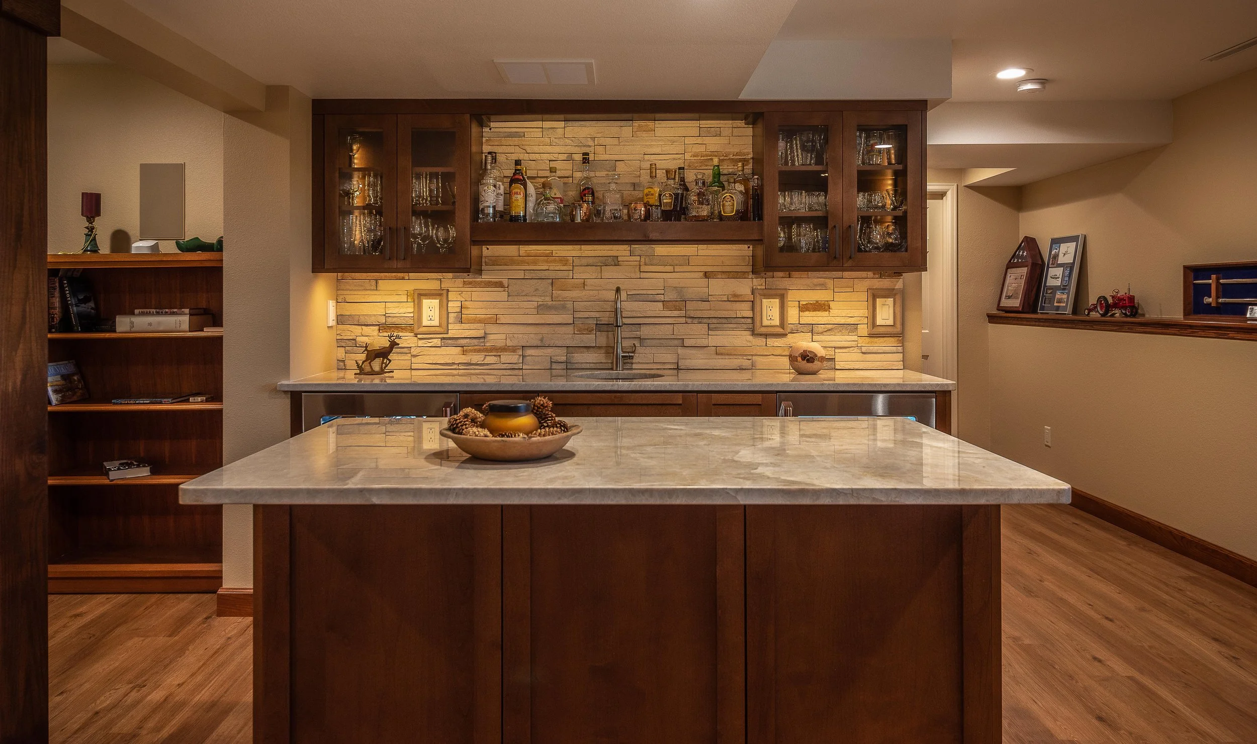 This basement was completely reimagined into a warm, masculine retreat centered around an inviting custom bar. Rich rosewood cabinetry sets a refined tone, complemented by a stacked-stone accent wall that adds texture and depth. Open shelving displays curated spirits and personal touches, giving the space both character and function. Just steps away, a cozy reading nook by the fireplace offers the perfect spot to unwind with a glass of whiskey and a great book. The result is a luxurious hideaway designed for relaxation, conversation, and quiet moments alike.
